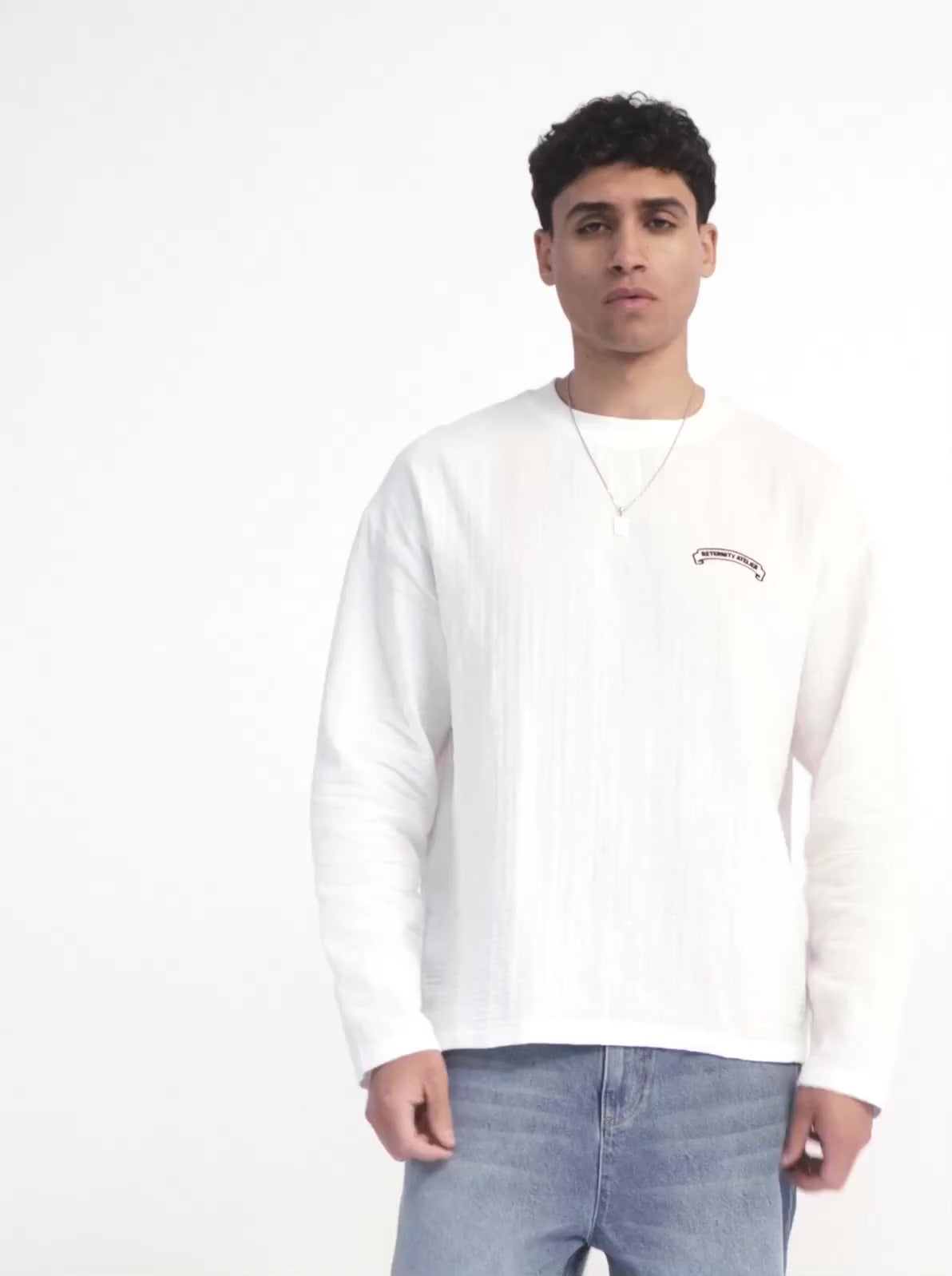 The BAND OF PROCESS LONGSLEEVE in white is crafted from a special 100% cotton muslin fabric with a lightweight 220 GSM feel. Soft, breathable, and textured, it features clean 2D embroidery on the front that adds a subtle graphic accent. Finished in a boxy, cropped fit, this piece combines relaxed comfort with refined construction.